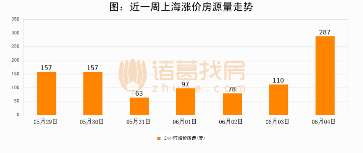 根据诸葛找房数据显示,上海24小时涨价房源量为287套,较06月03日增加177套,环比上涨160.9%。与此同时,涨价房源占比小幅扩大,业主信心有所提升。