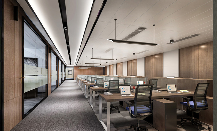 一个公司,单独的封闭式空间肯定不会少,这样空间内的办公室装修灯光设计,我们会根据具体情况,选择单独顶灯或顶灯+部分筒灯的设计,像是主管办公室,可能不需要太多氛围感,只需要满足基础照明,或者加上一些重点照明部分就好;而像总经理办公室,可能需要在基础照明、重点照明之外,为了迎合办公室装修风格、划分空间层次或是一些趣味小摆件,需要增添一些氛围照明。