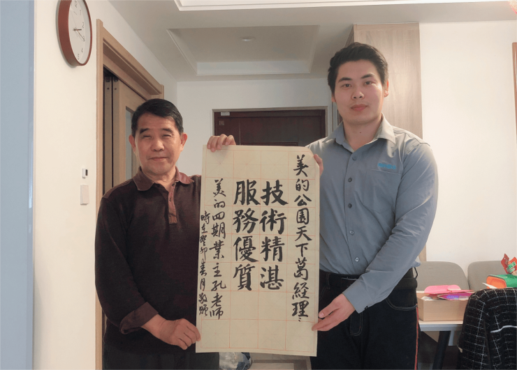 三月初,葛乾隆收到了业主送来的一面特殊的“锦旗”。徐州美的公园天下的业主孔老先生找到客关,反映了家中厨房出水的问题,葛乾隆迅速赶到现场,厨房出水位置不方便站立,他便蹲伏在地数十分钟,一层一层逐一排查,同时,葛乾隆还贴心地为业主更换了新的水阀部件,保证业主后续的使用体验,由于业主孔老先生是一名书法家,便亲自书写了一封“水墨锦旗”,感谢葛乾隆热心周到的服务。