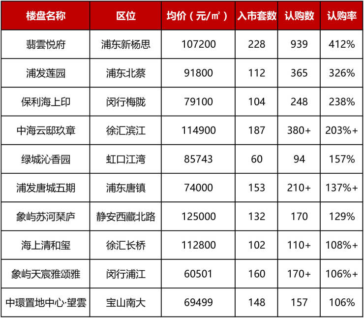 新杨思翡雲悦府228套房源收获939组认购,刷新今年上海新盘最高认购数。认购率约412%,入围分63.84,也是今年最高入围分。