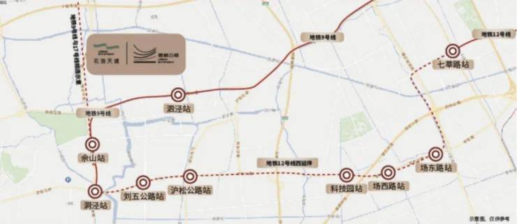 未来,12号线西延伸段将起始于七莘路站,与嘉闵线、机场联络线相交,最终抵至松江洞泾。从项目出发,2站即可换乘12号线西延伸段。