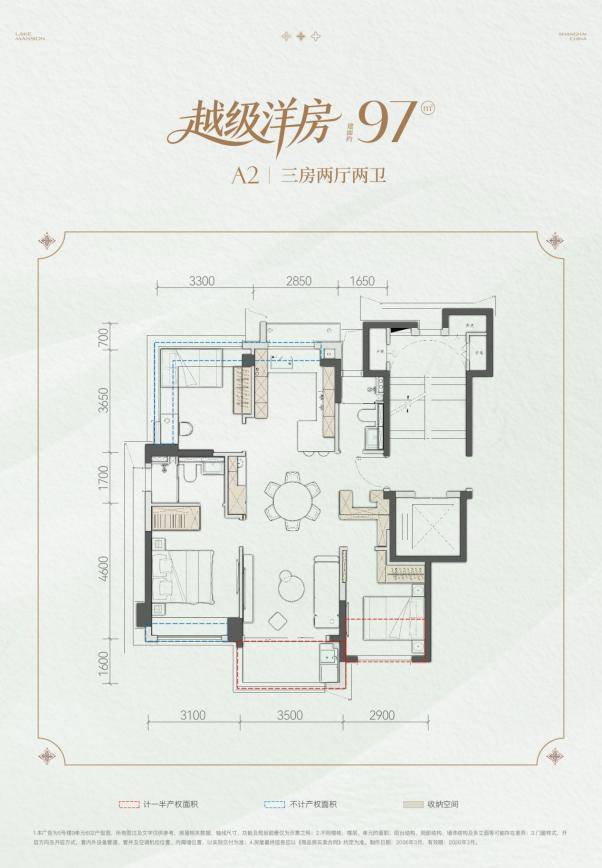 约97㎡「越级洋房」三室两厅两卫,以约86-90%的高实得率,采用零走道飞机户型设计,相当于常规市面产品的109m2产品,实现全明正三房的舒适体验。