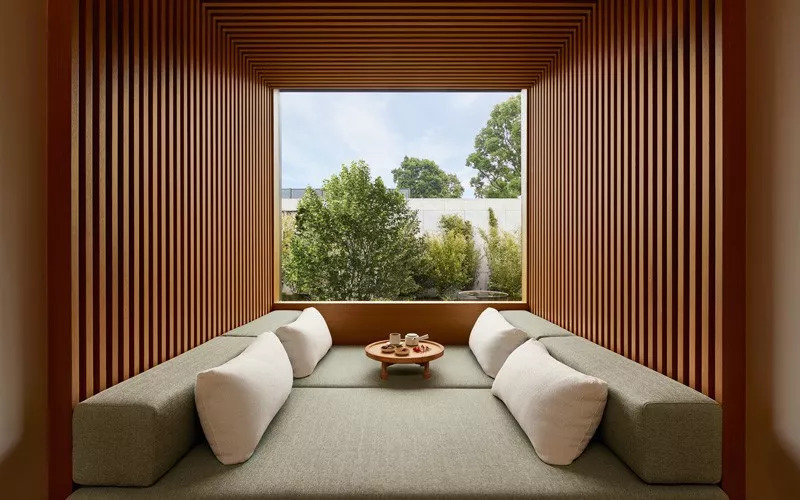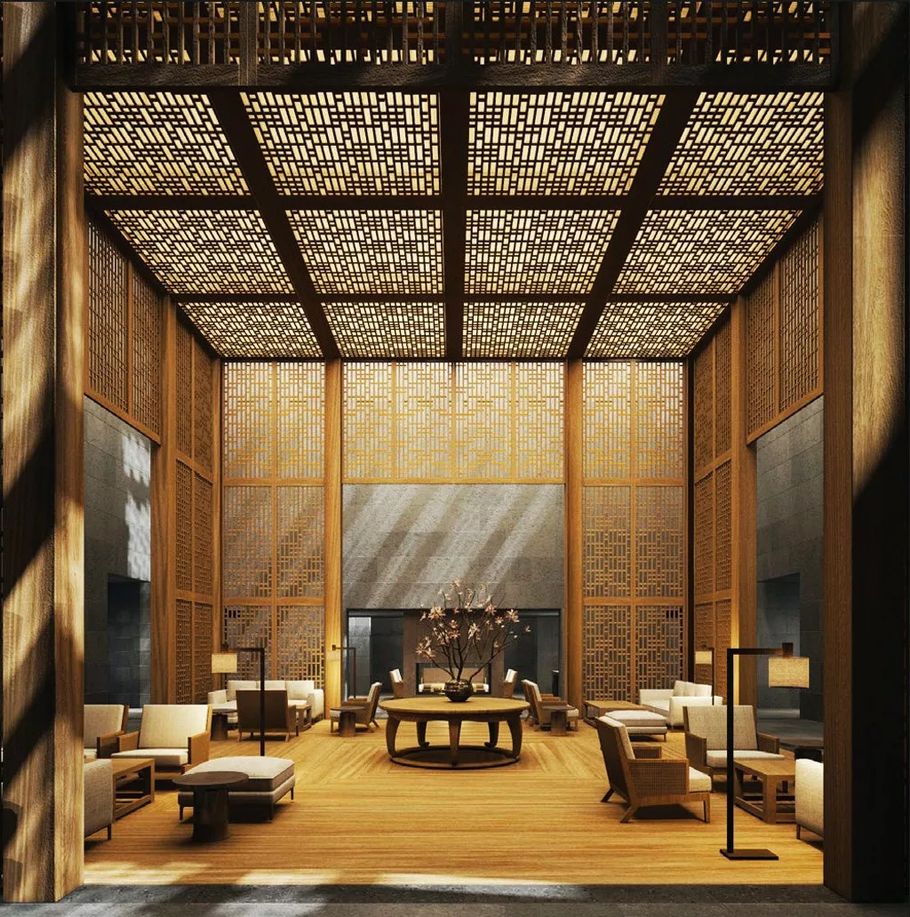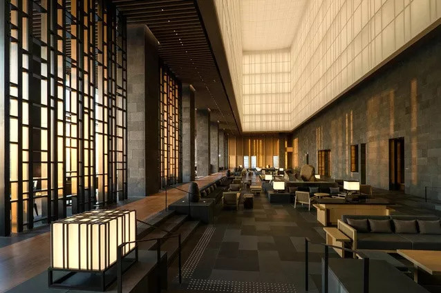 该设计通过细致的细节,和空间的流动,展现日本建筑的静默之美。东京 Aman 的设计亮点在大堂的休息室内,六层高的纸灯笼和天窗,充满了复古味。