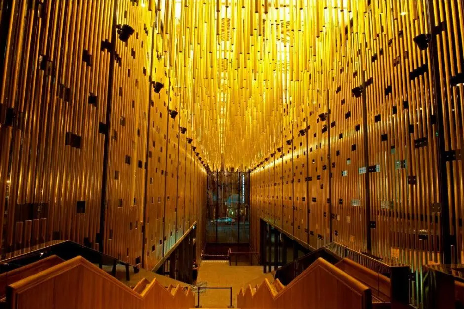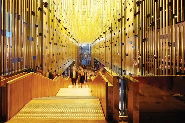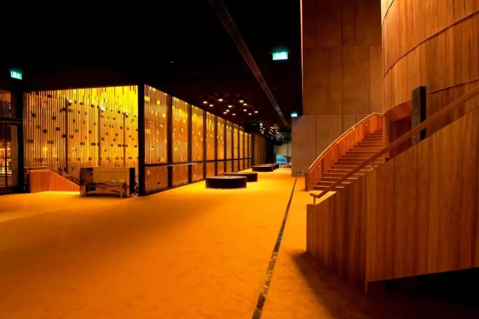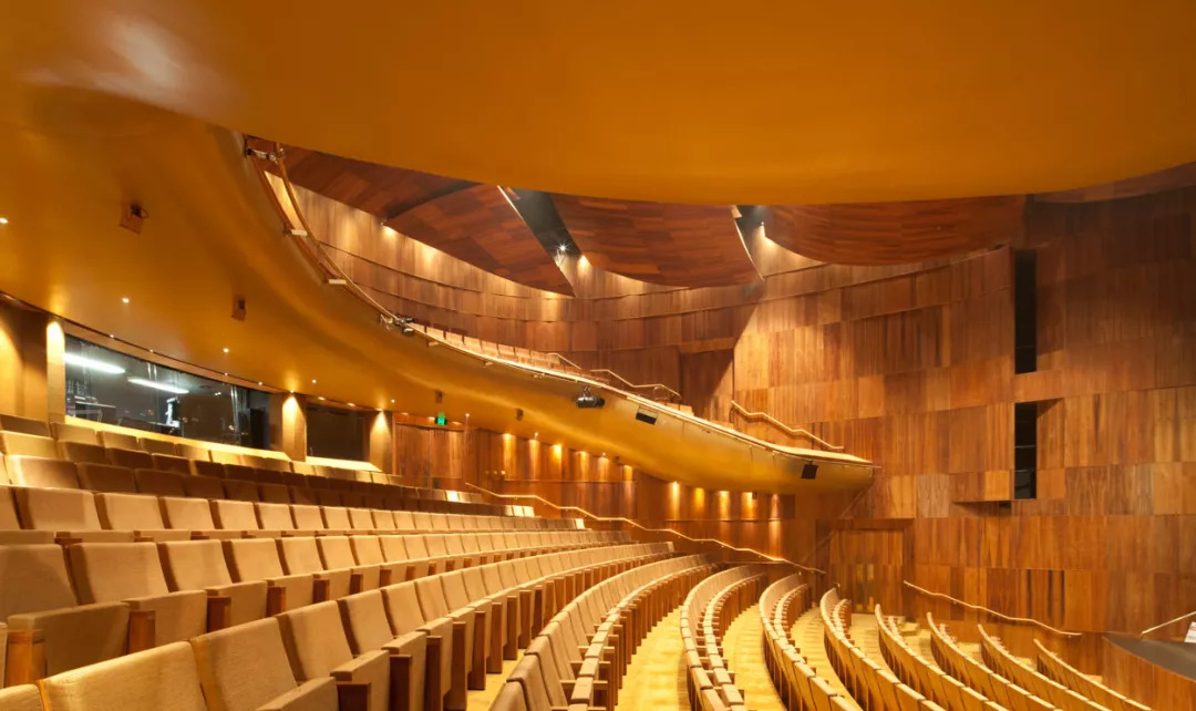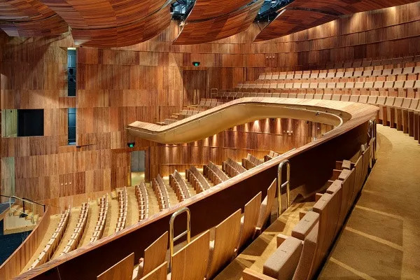 华丽的流通空间布置,在大楼梯上设有金色屏风和「钟乳石」,以达到增加混合戏剧体验的效果。白天,由几何线条包围的建筑物,传达出谦虚和宁静。到了晚上,排练空间和金色门厅的浓烈铂金色,散发着奢华的热闹与繁荣。