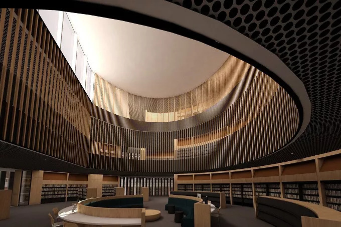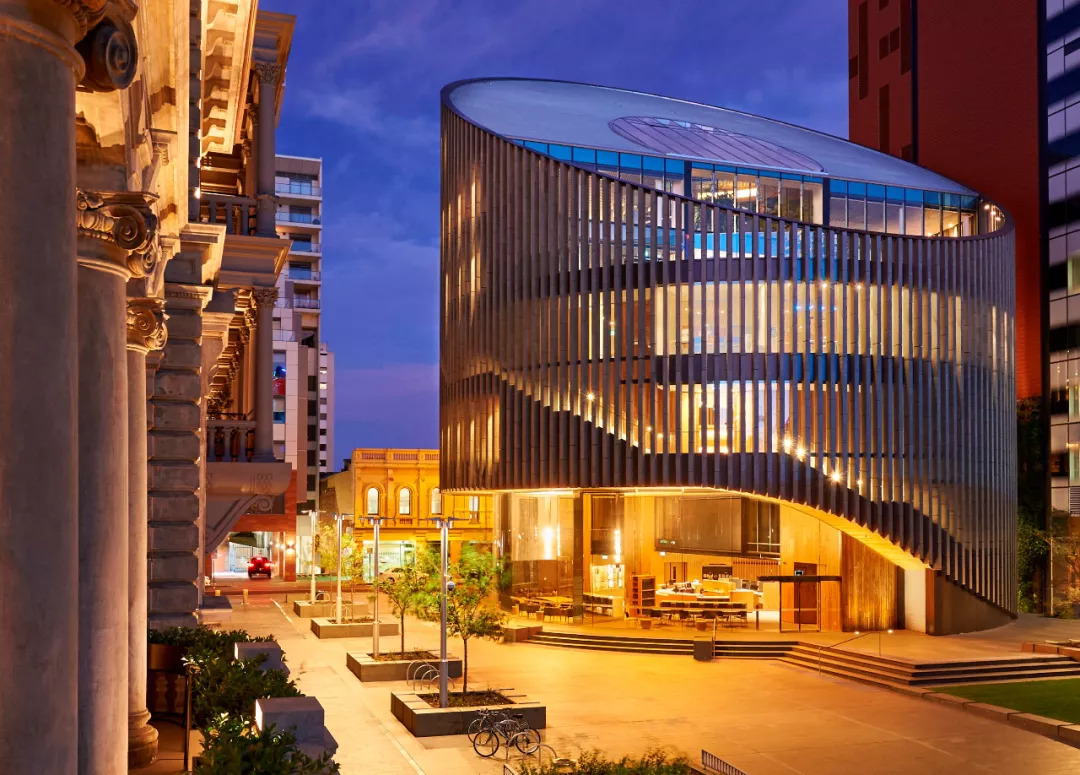 珀斯图书馆造价 6000万,占地3500平方米,整体为圆形的建筑构造。图书馆的外部恍若垂直的鳍片,在基座上环绕并扫过,露出玻璃底层。