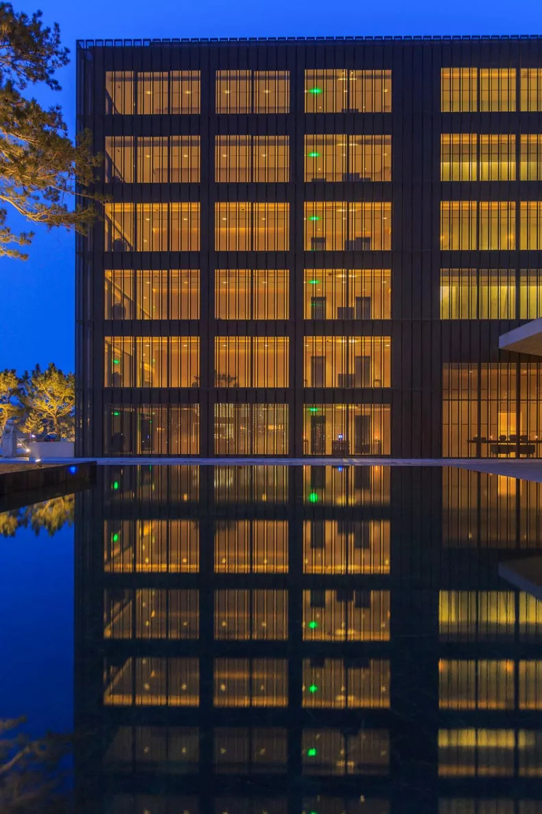 该酒店位于青岛市黄岛区,背依凤凰山,三面环海。以大开大阖的现代极简风格,将繁复炫目的装潢一一摒弃,让住客充分感受与碧海蓝天融为一体的悠闲与放松。据说是董事长五顾茅庐,最终才请来 Kerry Hill 担任酒店总设计师的。