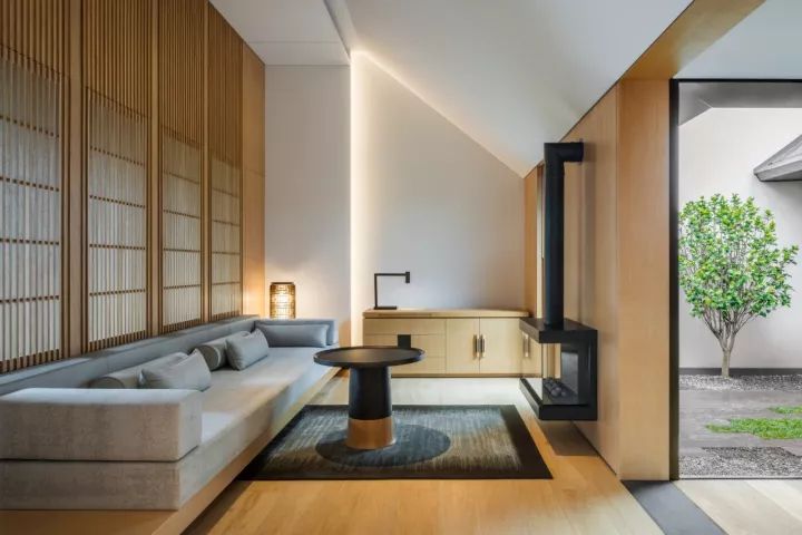 而蓝色或黑色织物覆盖的扶手椅,定制地毯和深色木材的屏风墙,无疑例外的展现日式和风与现代建筑交融的魅力。