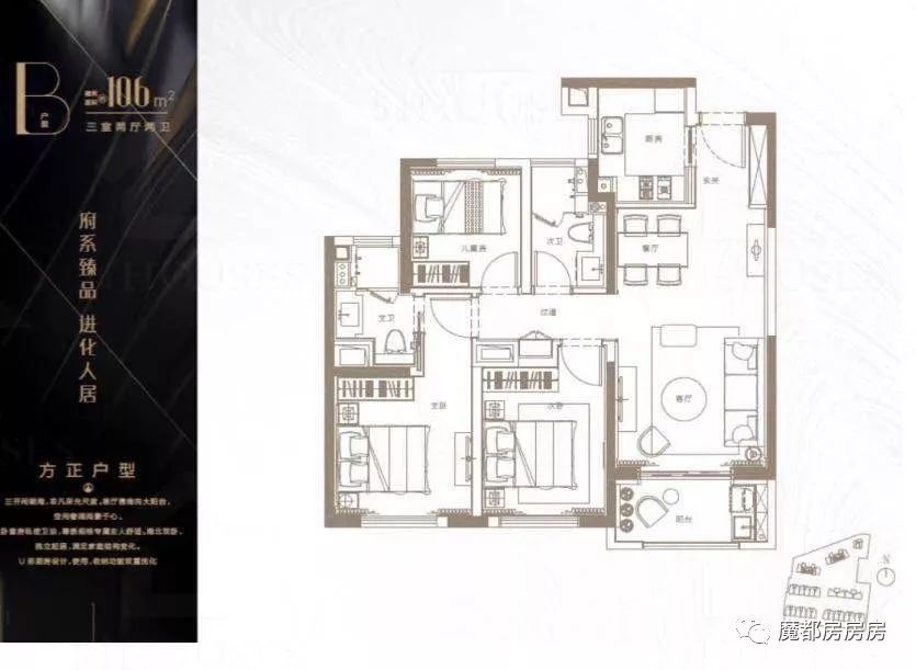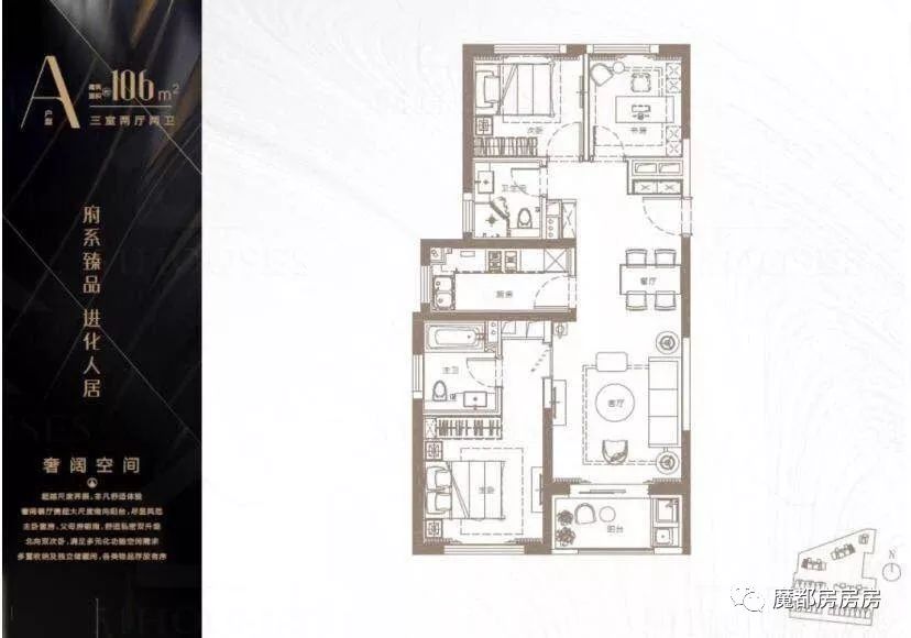 此次销售的两栋均为106平方的三房,两种房型皆是双卫配置,与现如今动辄90平方三房或是动辄160平方三房的新盘相比,106平方既不会过于拥挤,大小适宜又可以兼容三口之家,甚至三代同堂以及日益增多的二胎家庭的需求。少有的缺点则是主卧略小,但现代人赋予卧室的意义越来越局限,仅仅作为休息之处也是恰到好处的大小了。