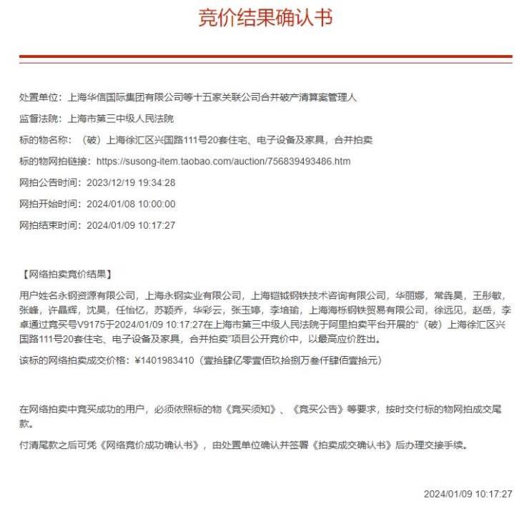 最终经过44次出价,用户姓名为永钢资源有限公司、上海永钢实业有限公司、上海铠钺钢铁技术咨询有限公司、华丽娜、常犇昊、王彤敏、张峰、许晶辉、沈昊、任怡忆、苏颖乔、华彩云、张玉婷、李培瑜、上海海栎钢铁贸易有限公司,徐远见、赵岳、李卓等以14.02亿总价拿下,房源折合均价约15.65万元/平米。