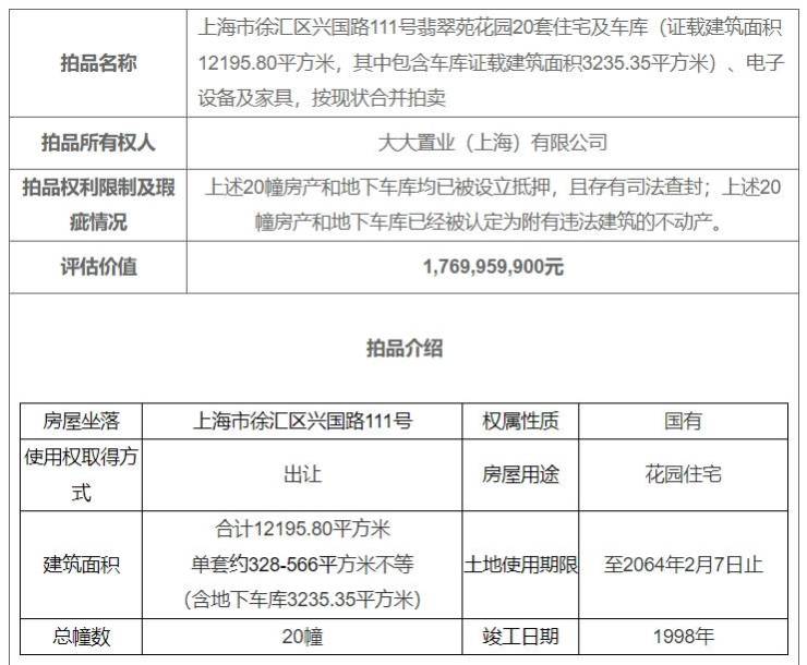 根据阿里法拍披露信息,1月9日,位于上海徐汇区兴国路111号的翡翠苑20栋别墅(含住宅、电子设备及家具等资产)经过多轮流拍降价后,以13.5亿元起拍,终于迎来买主。