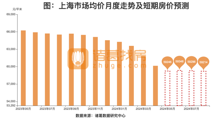 从房价水平来看,4月上海市场均价为60147元/㎡,环比下降2.73%,同比下降9.51%。根据情绪指数模型,预测上海未来短期内价格下降,未来4个月价格下降至59214元/㎡,累计下降1.55%。