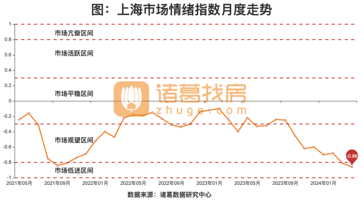 根据诸葛找房数据研究中心监测数据显示,2024年04月,上海市场情绪指数为-0.86,较上月下降0.05,位于市场低迷区间。