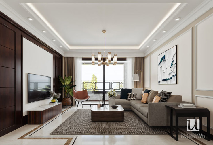 客厅风格以现代风为主,简单大方,却专注于每一个细节。灰色的沙发衬托着现代简洁的茶几,给人一种温馨的氛围,另外用一些木质材料、大理石元素来打造空间,同时与更贴近生活的现代风格相互融合,两者又不断地交叉、冲突、融合,让空间显得更加简洁、立体.....