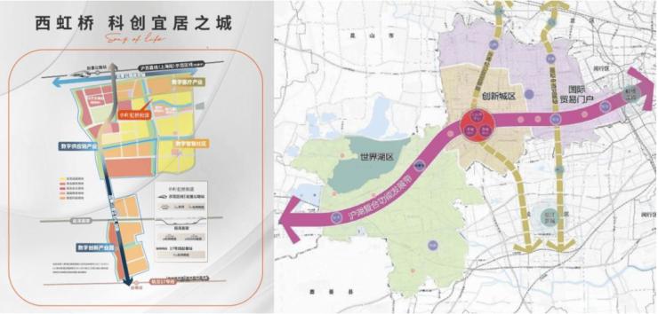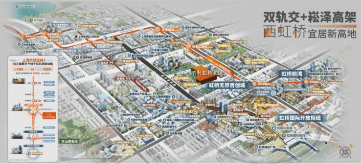保利虹桥和颂,择址的大虹桥-青浦区“虹桥无界百创城”,是链接虹桥商务区、青浦现代新城,长三角一体化示范区以及上海东西向发展轴带上的重点区域之一。虹桥无界百创城聚焦数字经济,正构建“一核”(即生命健康创新之核)两翼(即数字绿色科技产业“未来之翼”和总部服务经济“活力之翼”)的功能空间布局,赋能未来无限。