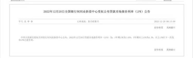 2022年12月20日贷款市场报价利率(LPR)为:1年期LPR为3.65%,5年期以上LPR为4.3%。