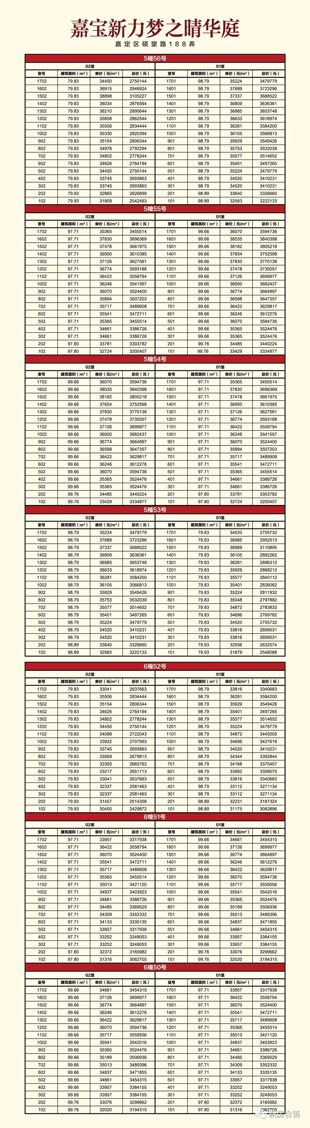 嘉宝新力梦之晴华庭在今年4月3日首次取证,高层+叠墅共330套房源(红色区域),到目前为此,仅剩少量低楼层和大户型再售;本次二期共552套房源取证(黄色区域),主力户型:建面约80㎡高层2房,102套;建面约98㎡高层3房,204套;建面约98㎡高层3房,102套;取证楼号为:3#的60、61单元,2#的62、63、64、65单元;建面约89㎡上叠,48套;建面约122㎡中叠,48套;建面约126㎡下叠,48套;取证楼号为:13#、14#、16#、17#、19#;