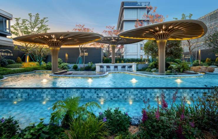 将海洋、森林、岛屿三大核心概念,具象化凝练到社区景观中,姿态各异乌桕林穿插、定制化的海浪铺装、精致优雅的酒店式软装外摆,国贸海屿佘山将一座“海上森岛”浓缩复刻,对话佘山自然肌理,营造山林之间稀有的海岛度假场域。