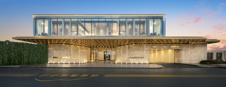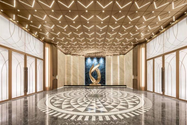 约60米度假酒店式大门,如同截取了一段辽阔的金色海平面,营造具有强烈海洋美学风格昭示性的形象封面;以彩釉玻璃打造的「蔚蓝光厅」,仿佛一座“漂浮”于大门上空的“海市蜃楼”,夜晚在定制的暖色灯光映照下,恍如邂逅一片霞光下的沙滩。