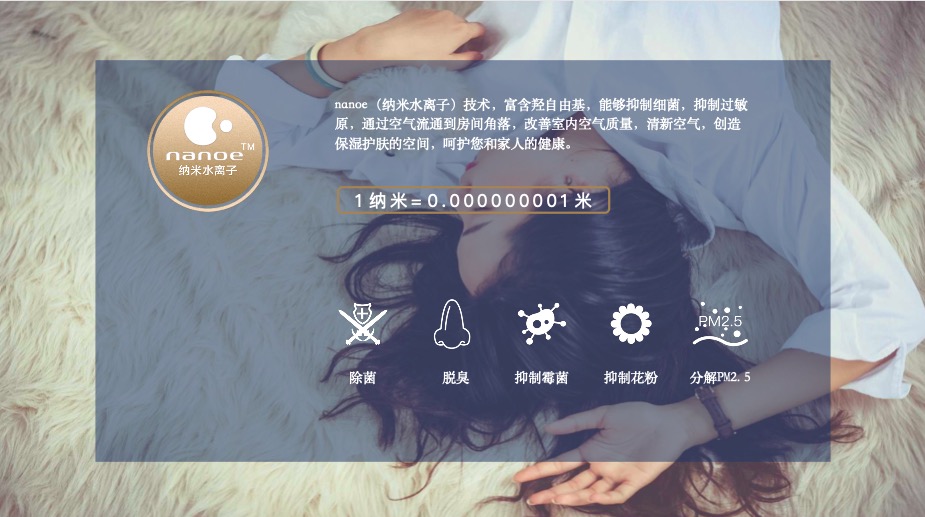 最后一重nanoe™纳米水离子技术的加持把关,富含羟自由基,能够抑制细菌、霉菌、过敏物质,快速分解难闻异味,全面改善空气质量。简洁方便的一键润养,深层滋养角质纤维层,滋润每一寸肌肤,滋养每一寸秀发,美发护肤靓丽先人一步,净化空气的同时给您和家人创造保湿护肤的空间,呵护您和家人的健康。真正实现空气净化更彻底,除菌更有效,呼吸更顺畅。