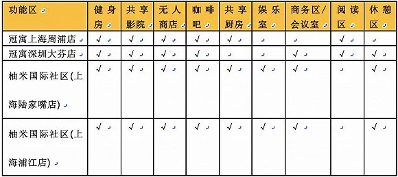 在中高端项目,公共区域更多的是承载社交、休闲、会客功能。明源君选取了冠寓、柚米位于上海和深圳的几家门店对比发现,健身房、咖啡吧、影院、无人商店基本是公区的标配。