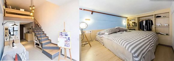 也有一些采用复式结构。如柚米国际这个35平的户型,阁楼除了放床之外,还定制了入墙衣柜。