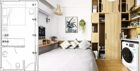 泊寓在一些迭代产品中,提出了每个房间收纳不少于5立方米。泊寓广州文冲店,30平一房一厨一卫,做了立体式书柜、橱柜和吊柜。采用高架床,床体也是大容量的收纳箱。满足了租客的厨具收纳、衣物收纳和日常用品收纳。
