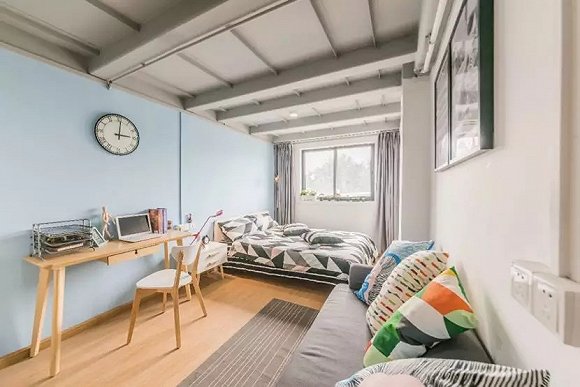 在青年公寓中,使用频率较高的,有床、卫浴间和衣柜,所以独立卫生间、床和衣柜是青年公寓的必选项,另外,大部分还有简易书桌椅。