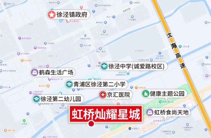 虹桥·灿耀星城,拥揽3公里繁华生活圈,人气爆棚的蟠龙天地、出片宝藏地夏都小镇、烟火气满满的徐泾生鲜菜市,徐泾第二幼儿园、徐泾小学、徐泾中学等环拱在侧,收拢一城精粹配套。