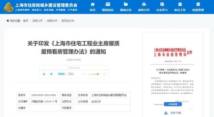 2023年3月,上海市建设工程安全质量监督总站(以下简称“市安质监总站”)推出《“业主房屋质量预看房”工作指南》,进一步完善工作要求。
