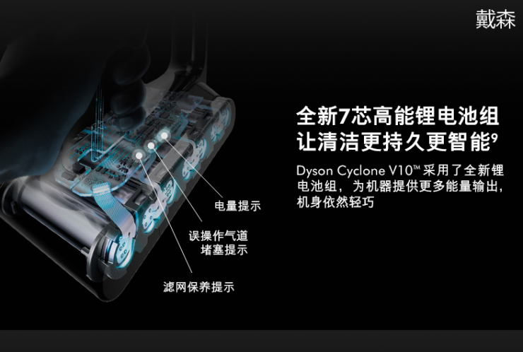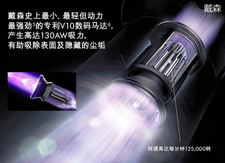 吸尘器最重要的一个性能就是吸尘器的吸力,戴森吸尘器几乎把吸尘器的这个性能发挥到了优质。戴森V10使用戴森史上最小、最轻、动力最强的V10数码马达,每分钟的转速为125,000转,可产生130AW的吸力,强劲的吸力可吸除肉眼可见及隐藏的污垢。戴森表示吸力的单位为气动功率AW,比静态压强单位KPA更能表示吸尘器的吸力。吸尘器在使用过程中是不断的吸入空气和灰尘的,静态压强无法表示流动的吸力。而且,戴森的每款产品在出厂前都会测试气动功率,只为反映吸尘器在真实使用过程中的吸尘能力。