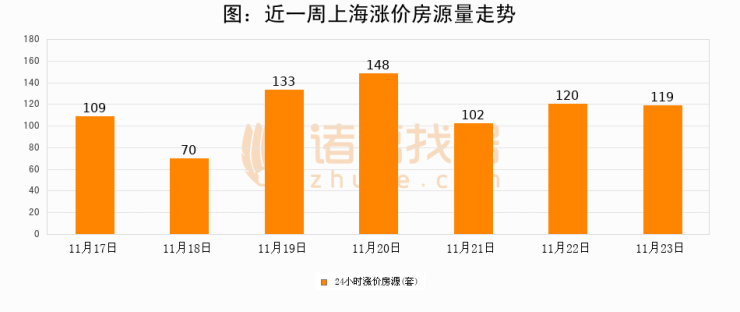 根据诸葛找房数据显示,上海24小时涨价房源量为119套,较11月22日减少1套,环比下降0.8%。与此同时,涨价房源占比小幅回落,对于购房者来说是一个入市窗口期,购房者可抓住时机入市。