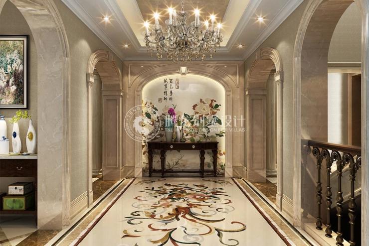 设计说明:该别墅在设计上定位为暖色调简欧风格,大理石的运用上以奥特曼色调为主,大块面的饱满线条去处理墙面造型,配以大色块驼色和浅咖啡色表现空间,结合业主喜好在设计时运用了大块面的处理手法,沉稳大气的同时彰显客户独特品位,通过提取传统家居的精华元素和生活符号进程合理的搭配、布局,在整体的家居设计中既有中式家居的传统韵味又更多的符合了现代人居住的生活特点。