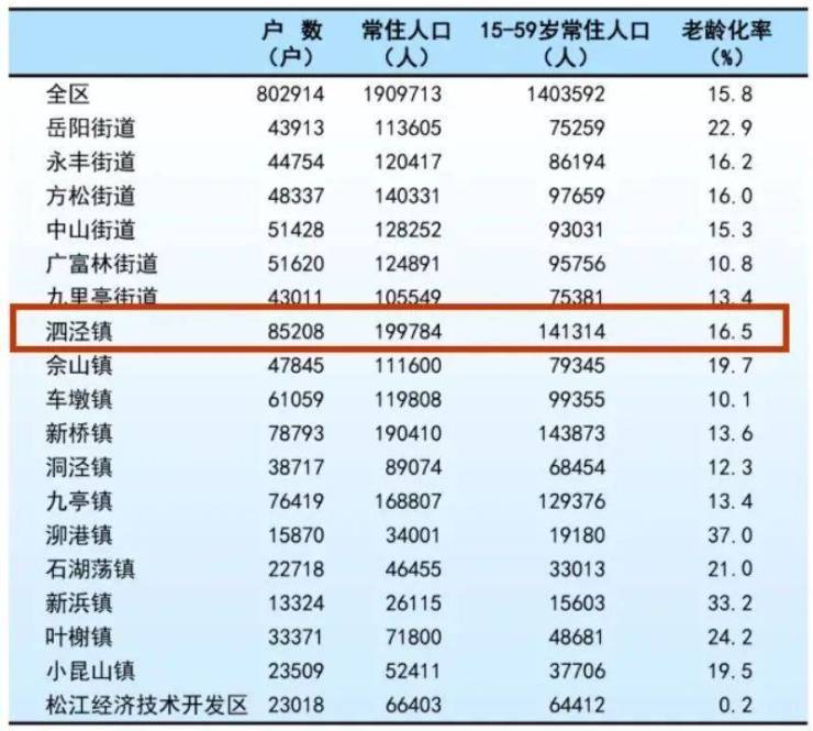 2021年松江区第七次人口普查中,泗泾镇以以常住人口约19.98万的数据规模,在松江区排名“榜首”,且老龄化率非常低仅约16.5%,远低于上海平均水平(23.4%)。