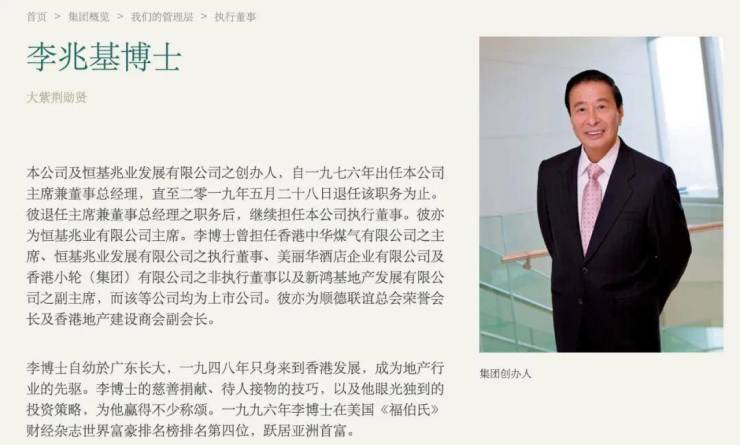 2020年9月10日,新鸿基地产发展有限公司发布公告称,李兆基年事已高,将不在公司于2020年11月举行的股东周年大会上寻求连任,并将于股东周年大会上退任公司非执行董事及终止出任公司董事局副主席。