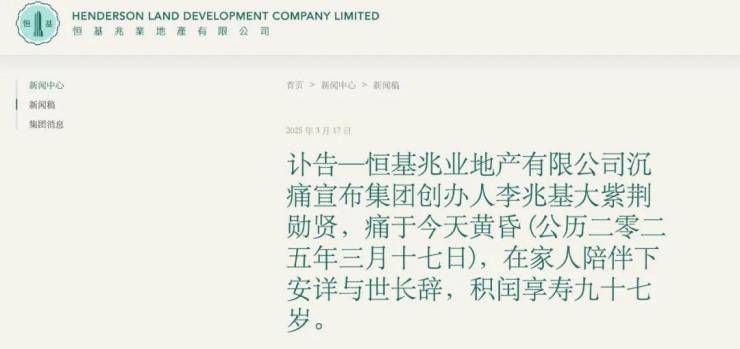 3月17日,据恒基兆业地产官网消息,集团创办人李兆基大紫荆勋贤,痛于今天黄昏(公历二零二五年三月十七日),在家人陪伴下安详与世长辞,积闰享寿九十七岁。