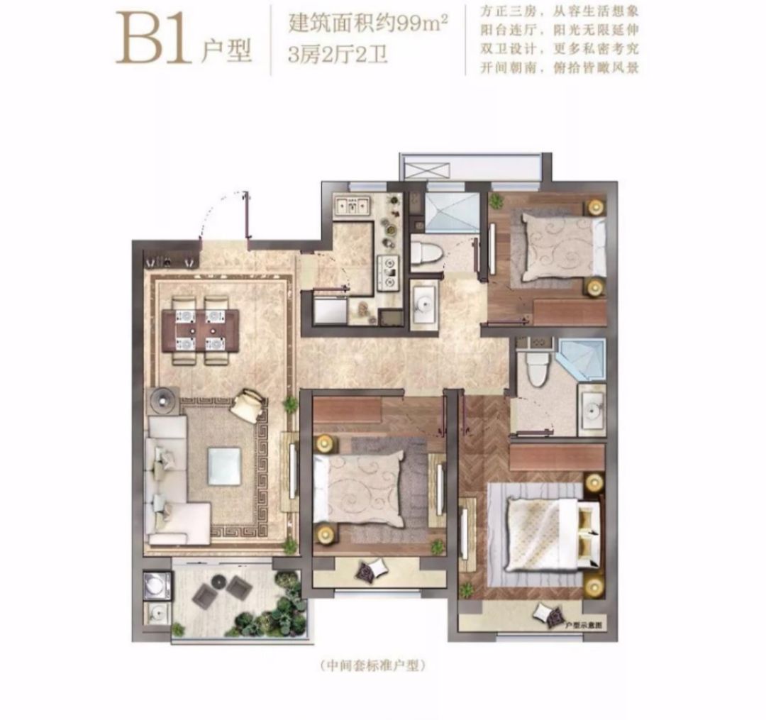 泰禾大城小院首开装修交付高层住宅主力户型图如下,B1户型约99平三房两厅两卫,三开间朝南。主卧室套房,超大阳台,超宽朝南面宽,次卫干湿分离,已经能满足大多数首置/首改家庭的需求,免去了换房困扰。