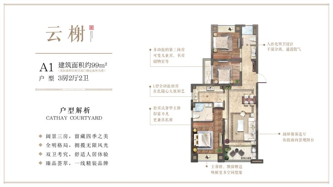 A2户型约99平三房两厅两卫,所有功能间全明,南北通透,边套户型私密性强。主卧次卧都带景观飘窗,收纳空间设计合理。