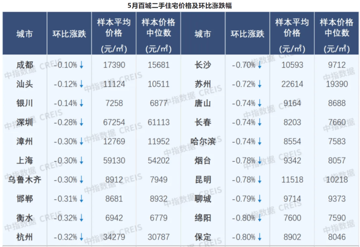 典型城市的二手房价格则出现调整。如二手房市场相对抗跌的城市包括成都、汕头、银川、深圳和漳州,5月二手住宅价格分别下跌0.10%、0.12%、0.14%、0.28%和0.30%。