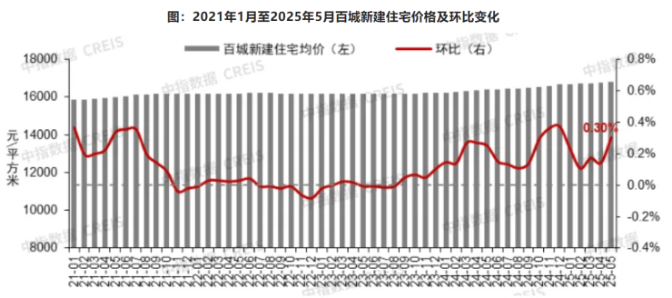 6月1日,中指研究院发布的“百城价格指数”显示,5月份百城新建住宅平均价格为16815元/平方米,环比增长0.30%,同比增长2.56%;二手住宅平均价格为13794元/平方米,环比跌幅扩大至0.71%,同比下降7.24%。