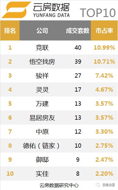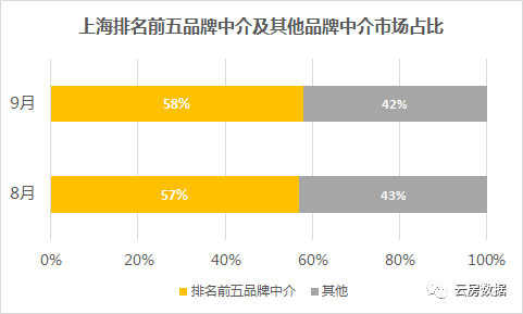 成交量排名前五的中介品牌仍被德佑(链家)、悟空找房、太平洋、易居房友、中原占据。其中,排名排名前列的德佑(链家)市占率由上月24.93%上涨至28.39%。9月,上海中介集中度保持相对稳定,其余中介品牌市占率波动较小,略有小幅下降。