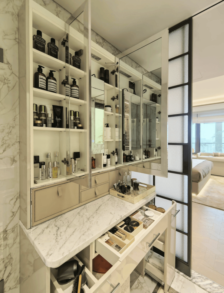 这是化妆柜打开后的场景,内嵌美妆冰箱、收纳体系,非常符合女性业主的生活习惯。
