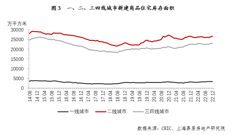 截至2022年底,100个城市中一、二、三四线的新建商品住宅库存总量分别为3360、26572和23126万平方米,相比2021年底增速分别为7.4%、-0.1%和2.0%。从城市结构看,一线城市的库存拉升态势较为明显,这和一线城市受疫情冲击较大、年底加快推盘等因素有关。而二线城市出现罕见的库存下跌现象,一方面或说明受烂尾楼事件影响,二线城市新盘供应受冲击;另一方面也说明,四季度持续的购房政策,刺激了部分购房需求,消化了部分库存。对于三四线城市而言,返乡置业需求在减弱,客观上也对去库存造成压力。