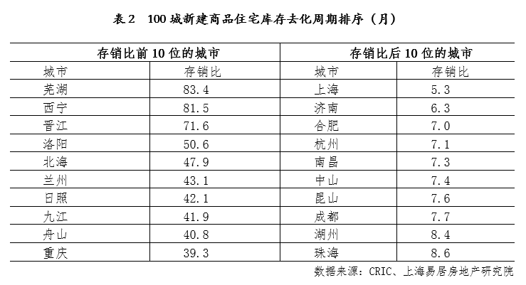 2022年底,从排序可以看出,包括上海、济南和合肥的去化速度相对好,存销比分别为5.3、6.3和7.0个月。其中上海去化速度成为全国最好。在上海受到疫情冲击的较大压力下,上海楼市依然保持积极复苏、持续活跃态势,充分说明上海楼市的基本面向好,也体现出上海市场购房需求充足的特点。总体上看,全国100个城市中,有39个城市去库存周期超过24个月即两年。此类城市更是需要用足用好购房政策、加快去库存,尤其要把“大力促进住房消费”作为2023年房地产工作的重中之重。