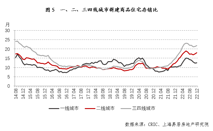 2022年底,100个城市中一、二、三四线的新建商品住宅存销比分别为12.4、18.0和21.9个月。总体上,一线城市去化周期相对好,二线城市居中,而三四线城市最大。三类城市去化周期都超过一年,说明销售压力都很大。当然三类城市也有差异。其中一线城市到了下半年去化压力有所缓解,和上海等个别城市交易市场拉升有关;二三线城市则改善不佳,其中二线城市烂尾楼事件对销售端冲击较大,影响了去库存的速度。