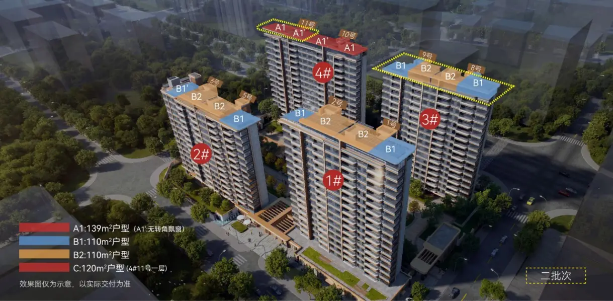 另外,建面约139㎡4房A1户型,这个是目前最受欢迎的真改善产品,也是最懂现代女性的需求痛点。四开间朝南,拥有约15.05米的南向面宽,采光通风无死角;大横厅连接大阳台,空间方正阔绰。北次卧可以布置为瑜伽室或者书房,享受个人时光;主卧套房空间方正,步入式衣帽间加独立卫浴,化妆镜柜带冷藏功能,令人惊喜;270°转角飘窗,带来的不只是景观视野,更是一种生活的享受。这种设计不是堆砌功能,而是真正懂女性在家庭与自我间的平衡需求。