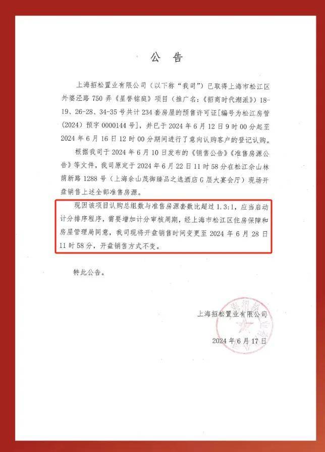 招商时代潮派234套房源吸引310+组认购,认购率超过130%,越线触发积分!这个认购率看起来超乎预计,开发商不得不“延迟开盘”,将开盘时间由原定的6月22日推迟到6月28日。