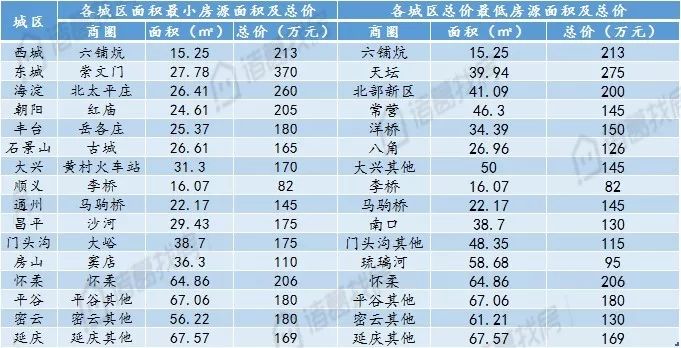 北京各城区面积最小房源及总价较低房源情况