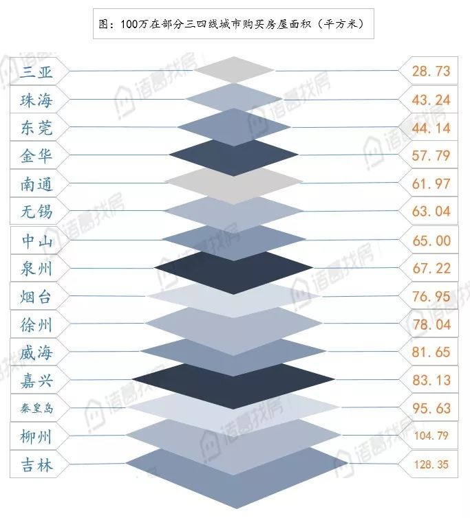 其中三四线城市中除三亚外可购买面积均在40平方米以上,三亚得益于其独特的环境优势及地理位置优势房价较高,100万在三亚仅可购买28.73平方米。