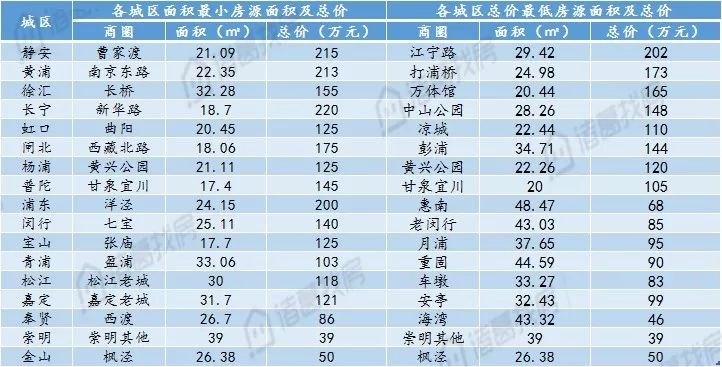 上海各城区面积最小房源及总价较低房源情况