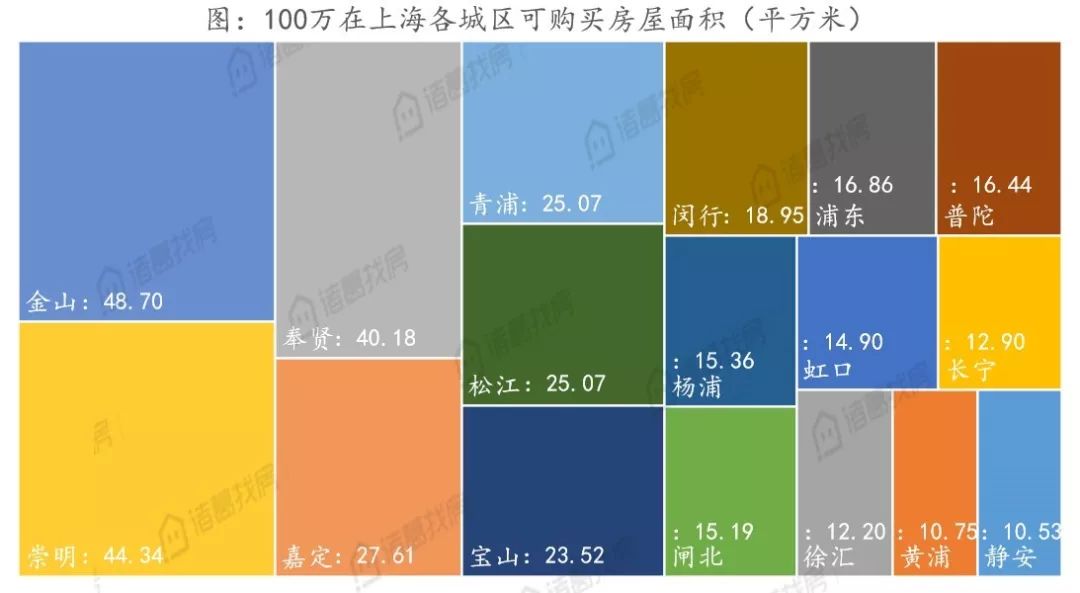 其中闵行区可购买面积最少,仅可购买18.95平方米,其余各郊区可购买面积均超20平方米,金山区可购买面积最多为48.70平方米。
